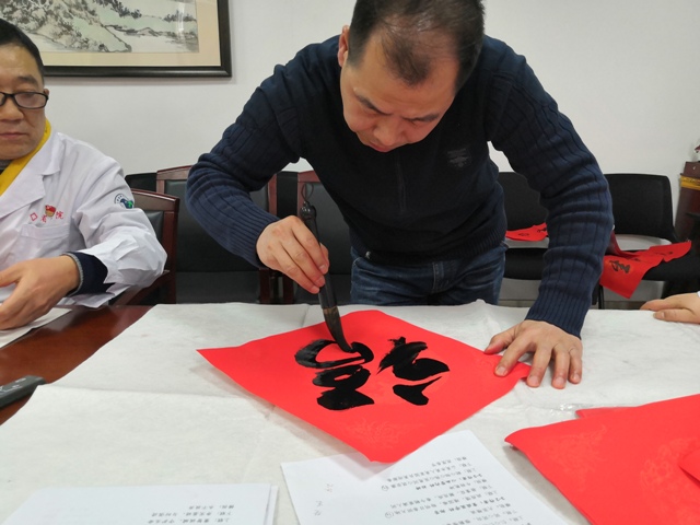 活动由医院工会组织,各科室、医院书法爱好者积极热情参与。在住院部大楼一楼大厅和会议室活动现场,书法爱好者们纷纷提笔挥毫,笔走龙蛇,书写春联,处处可闻墨香阵阵......志愿者们有的帮老师铺纸,有的帮着晾晒墨迹未干的对联。墨香与书香融合,现场其乐融融,充满了节日的喜庆气氛。原汁原味的创作生动质朴,一幅幅吉祥喜庆、翰墨飘香的春联和一张张“福”字代表了一份份温馨的祝福,书法老师专注的书写也让每一位职工感受到了中华传统文化的魅力,不时引得过往患者、家属、医护人员驻足观看,争相领取美好新年祝福。