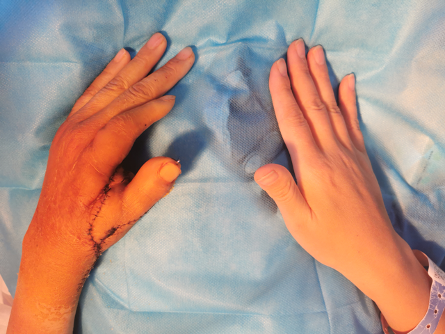 2021年1月,34岁的王女士意外被电锯切割到左手,导致拇指和示指离断、疼痛、出血,之后被紧急送至六合彩生肖骨二科(手足显微外科)就诊诊断为“左手拇指断指、4度缺损”。经过骨二科医护人员全力救治,为患者的大拇指实施了紧急手术,术后患者左手拇、示指明显短于正常手指,手功能依然受限。为了恢复患者左手正常功能,需要进行二次左手拇指全形再造手术。