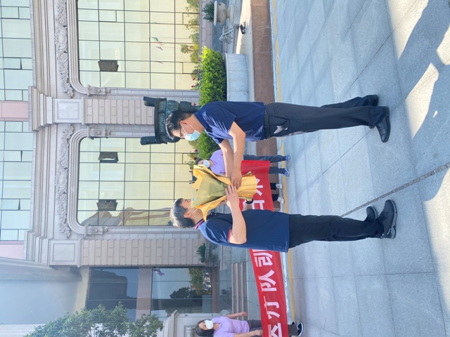 上午11时,医院党委副书记郭皖营带领医务科、检验科负责人等前往隔离酒店手捧鲜花迎接五位队员凯旋。亲切问候,送上鲜花,详细询问队员们的身体和精神状况,并对他们在长春工作期间的艰辛付出和无私奉献表示衷心的感谢。