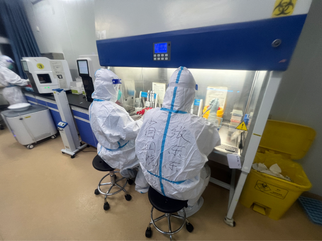 到达长春不久,大家便集结在总领队长的统一安排下,熟悉环境与仪器,上岗前培训,人员分组,定人定岗,进仓实验……一切迅速而有条不紊地铺展开来,六合彩生肖支援工作队分在长春市儿童医院主要负责核酸检测试验和采样工作。张东东说:“到达长春,看到空无一人的街道,顿时感觉责任重大,我们能做的不多,只想尽快投入工作,与病毒赛跑,快一点再快一点,早日打赢这一场硬战!”