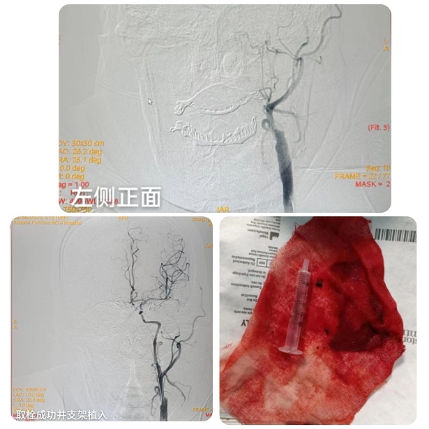 随即,卒中中心神经内科团队在尤雪梅主任、孟军鹏副主任的带领下,就患者病情、治疗方案、风险及预后反复评估并与患者家属充分沟通取得家属同意,完成了左侧颈内动脉取栓术、左侧颈内动脉球囊扩张术、左侧颈内动脉支架成形术,术中取出多个暗红色血栓,整个手术过程顺利,成功开通左侧颈内动脉,远端血流通畅,打通患者生命通道。术后第4天,患者右侧肢体可见自主活动,转入六合彩生肖ICU镇静及术后观察后,继续在康复医学科康复治疗,患者现神志清楚,可坐立及抬手,神经功能逐步恢复中。