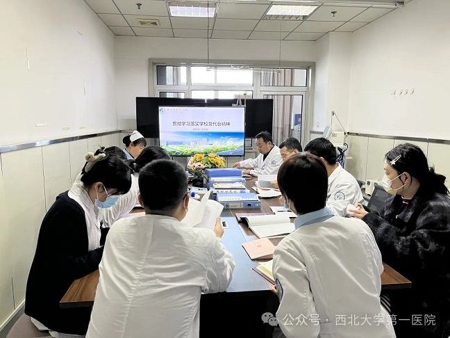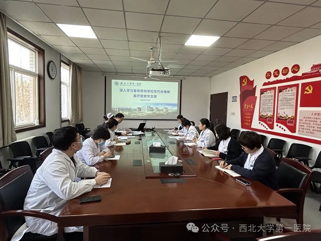 内科第一党支部开展“学习贯彻党代会精神,凝心聚力开启新篇章”为主题党日专题学习活动,组织支部全体党员,入党积极分子、支部科室主任、护士长以及研究生青年骨干医生参加会议。支部书记、心内科主任王选琦作为学校第十四次党代会代表向大家传达了党代会精神、详细解读了报告中的重要观点和要求,分享了自身参会体会。参会人员立足本职工作结合五星级党支部和省级重点临床专科,国家标准化胸痛中心等重点工作把学习贯彻党代会精神融入到日常和经常,把此次党代会报告作为今后发展的行动纲领,团结拼搏,开拓进取,时刻牢记医者使命,把为民服务落在实处,以坚定信心和昂扬姿态奋斗新征程,不断巩固提升五星级党支部、省级重点临床专科、国家标准化胸痛中心内涵等再创新辉煌,将党建工作与科室发展进一步融合,促进科室全面发展。为学院型医院建设做好引领示范,作出积极贡献。