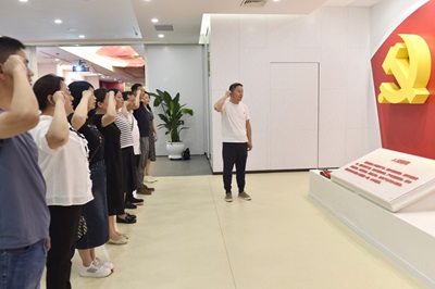 参观结束后,全体党员面向党旗肃立,举起右拳,在第一医院党委办公室胡洪兵老师的带领下,重温入党誓词。整齐洪亮的声音是每一位同志对党忠诚、坚决维护党中央权威、坚决贯彻执行全面从严治党的决心与信心。