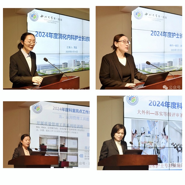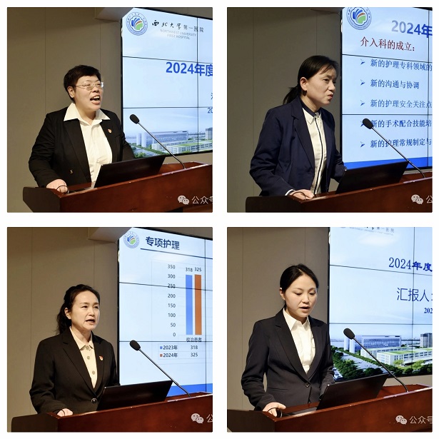 会上,38名临床、门诊科室护士长及副护士长分组依次以PPT汇报形式围绕“德、能、勤、绩、廉”对2024年科室护理亮点工作完成情况进行汇报,分享了在提升护理质量、保障患者安全、专科护理建设以及护理教学培训科研、团队文化建设等方面的经验和创新亮点,同时对工作中存在问题进行剖析,根据专科特点对2025年工作目标和发展思路进行阐述。