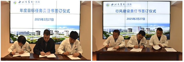 随后,举行医院年度目标任务责任书、安全生产责任书、行风责任书签订仪式。院党委书记陈晨、副院长聂书伟分别与神经内科、检验科、后勤保障部、急诊科、心血管内科、骨科三病区负责人代表签订了责任书。