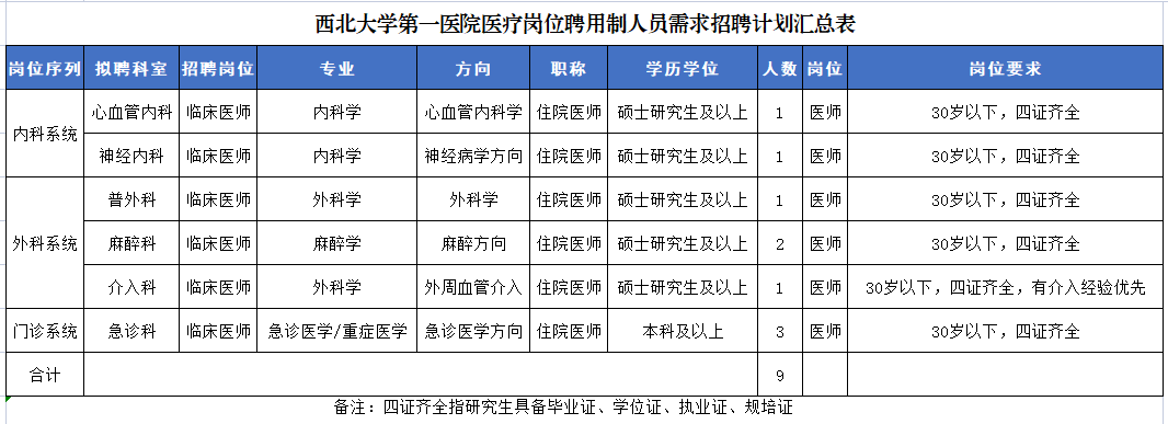 4.学历要求:住院医师学历为硕士及以上(除急诊科);