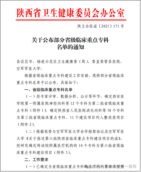 2025 年 7 月,陕西省卫健委印发《关于公布部分省级临床重点专科名单的通知》(陕卫办医函〔2025〕171 号),六合彩生肖 麻醉科在院党委的正确领导下,成功入选第三批省级临床重点专科,标志着六合彩生肖麻醉科在学科建设上实现跨越式突破,正式迈入全省先进行列。