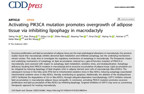 李会晓副主任在会上分享了研究成果和科研体会。该研究聚焦巨指症的发生机制,首次揭示了PIK3CA突变与泛素化介导的自噬调控在巨指症脂质代谢重编程中的关键作用。研究发现,巨指症脂肪组织中存在特异性PIK3CA突变,导致PI3K/AKT/mTOR通路过度激活,同时抑制自噬流,进而引起脂肪细胞肥大和脂质堆积。研究团队还发现了"USP15-Plin1-p62"调控轴在疾病发生中的重要作用,通过实验证实靶向抑制USP15可促进脂滴降解。这些发现为临床治疗提供了新的思路和靶点。李会晓副主任表示,科研工作需结合患者实际需求与前沿技术,才能产出有价值的高水平成果。